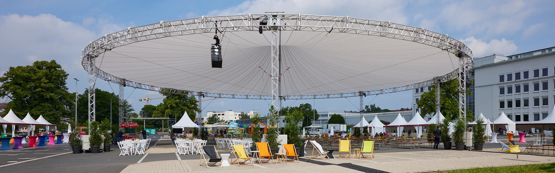 Wir planen und realisieren maßgeschneiderte Zeltlösungen für jede Art von Veranstaltung. Stabil, flexibel und optisch ansprechend, bieten unsere Zelte den perfekten Rahmen für Ihr Event – kombiniert mit Strom-, Wasser- und Techniklösungen für einen reibungslosen Ablauf.